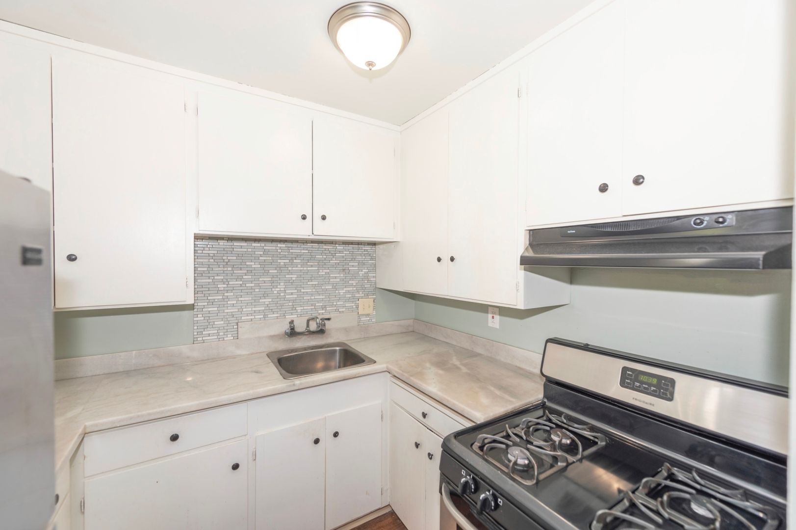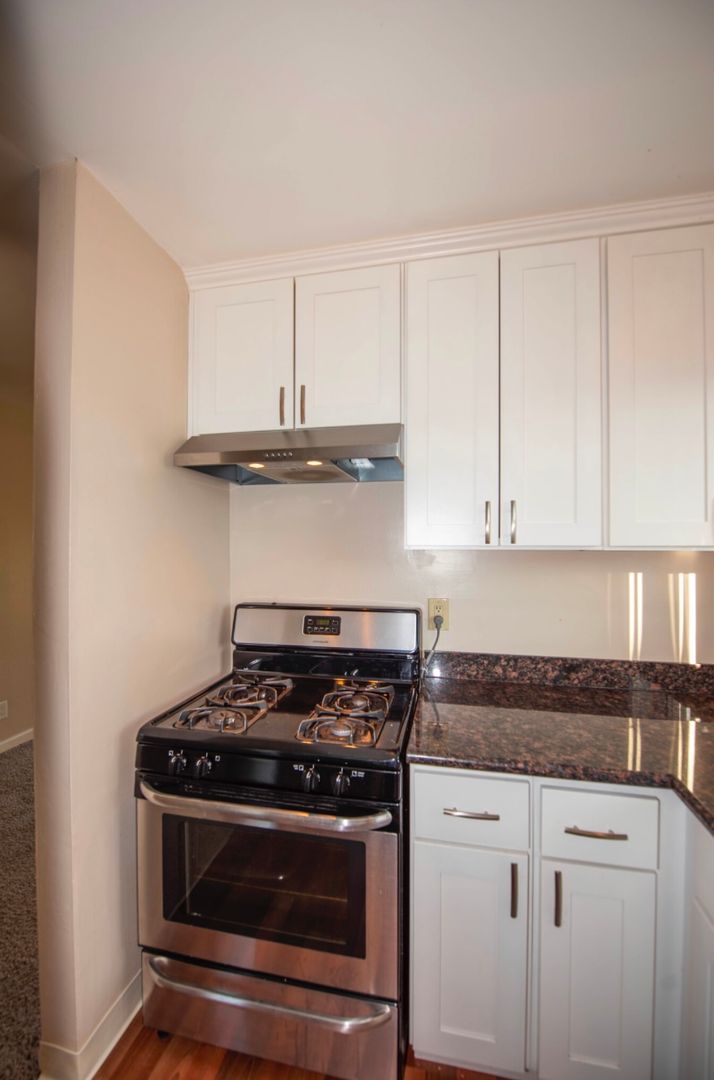 Updated kitchen. Adjacent dinette area with ceiling fan & light fixture. Kitchen cabinets provide plenty of storage space. Appliances include a refrigerator, gas stove/oven, hood over stove with excellent ventilation for those that enjoy cooking with a breeze!